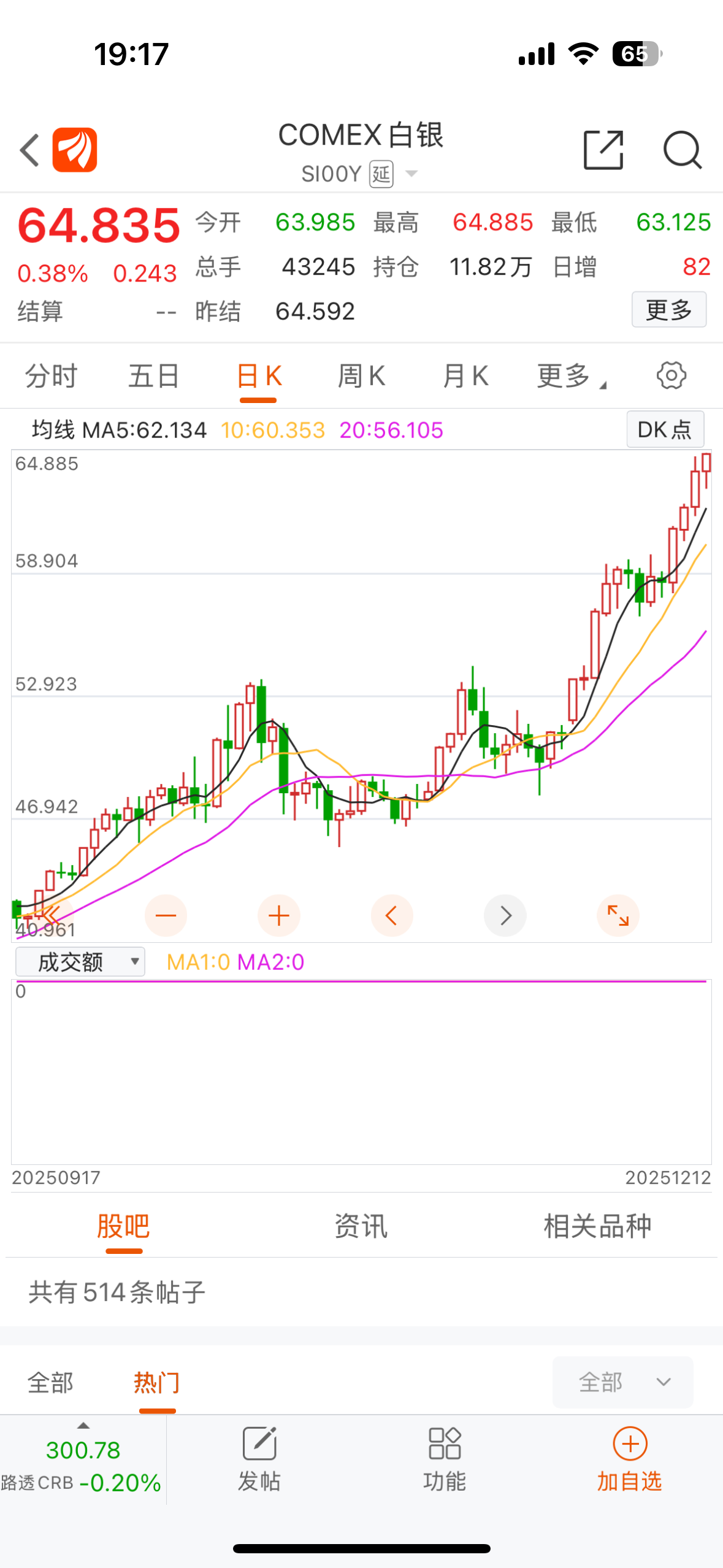 12月9日双悦网,现货白银首次突破每盎司60美元,站上新台阶;12月11日盘中触及64.31美元/盎司历史高位,最终实现年度翻倍涨幅。