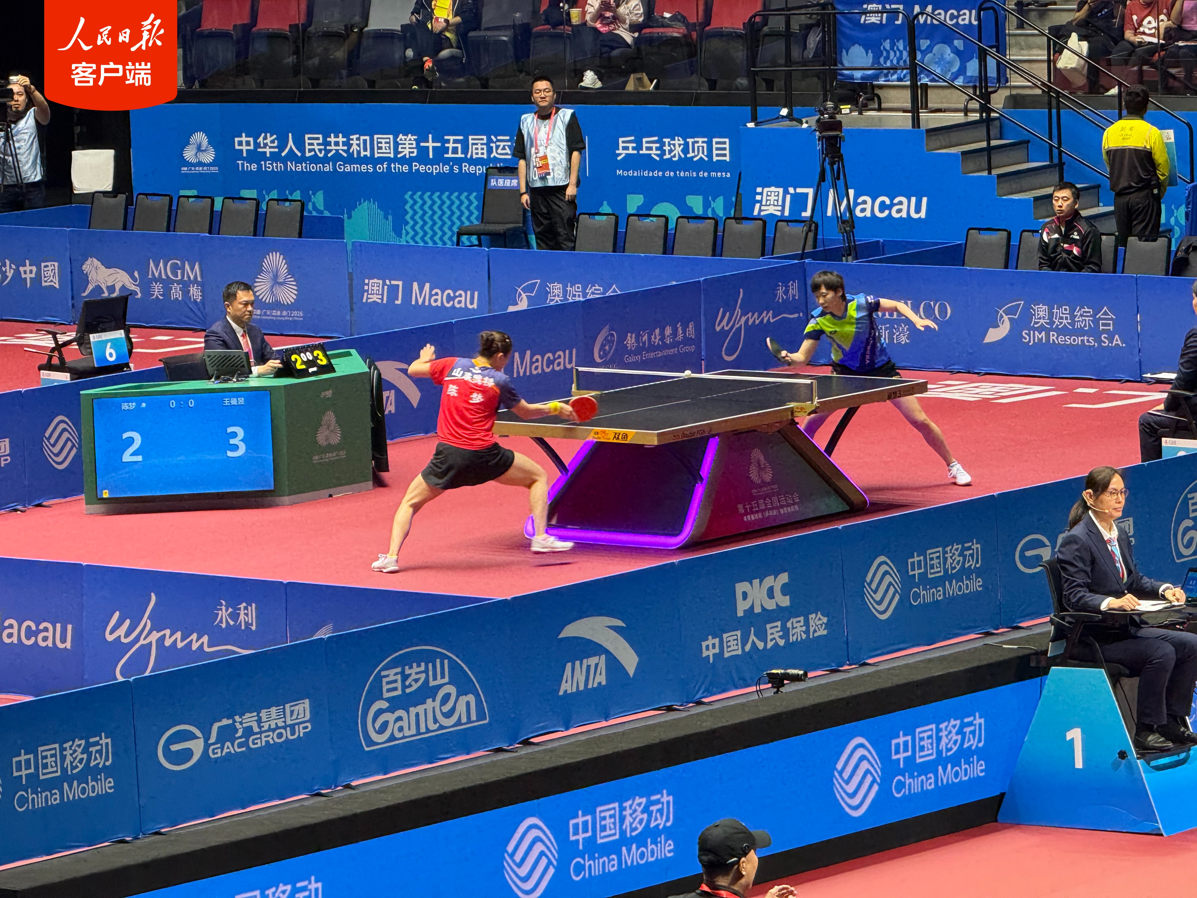 11月15日晚,十五运会乒乓球项目在澳门银河综艺馆展开两场女单半决赛争夺。刚刚,黑龙江队选手王曼昱以4∶0战胜山东队选手陈梦,晋级女单决赛。她将在决赛中对阵河北队选手孙颖莎和澳门队选手朱雨玲之间的胜者。