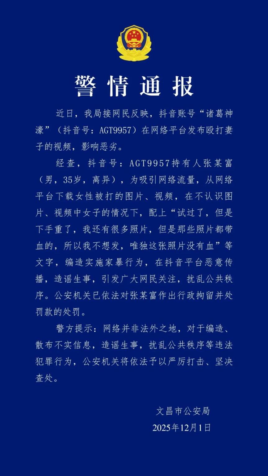 近日,文昌市公安局接网民反映,抖音账号“诸葛神濠”(金多多策略抖音号:AGT9957)在网络平台发布殴打妻子的视频,影响恶劣。