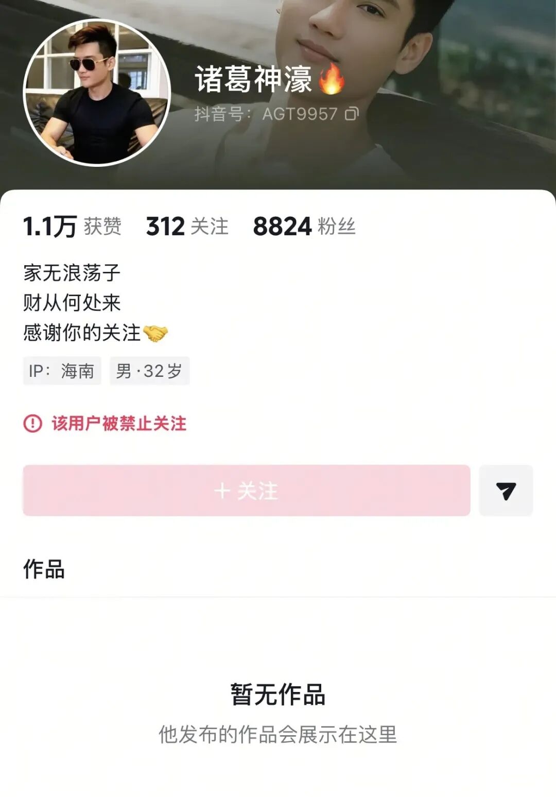 长安街知事(微信ID:Capitalnews)搜索发现,目前,该账号在抖音平台已无法检索,相关截图显示账号已被禁止关注。