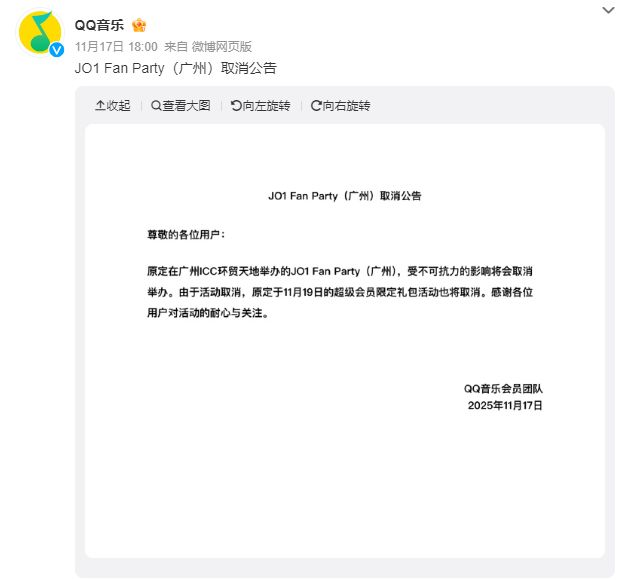 11月17日晚,QQ音乐在社交网站上发布一则公告称,“原定在广州举办的JO1 Fan Party,受不可抗力的影响将会取消举办。由于活动取消,原定于11月19日的超级会员限定礼包活动也将取消。”